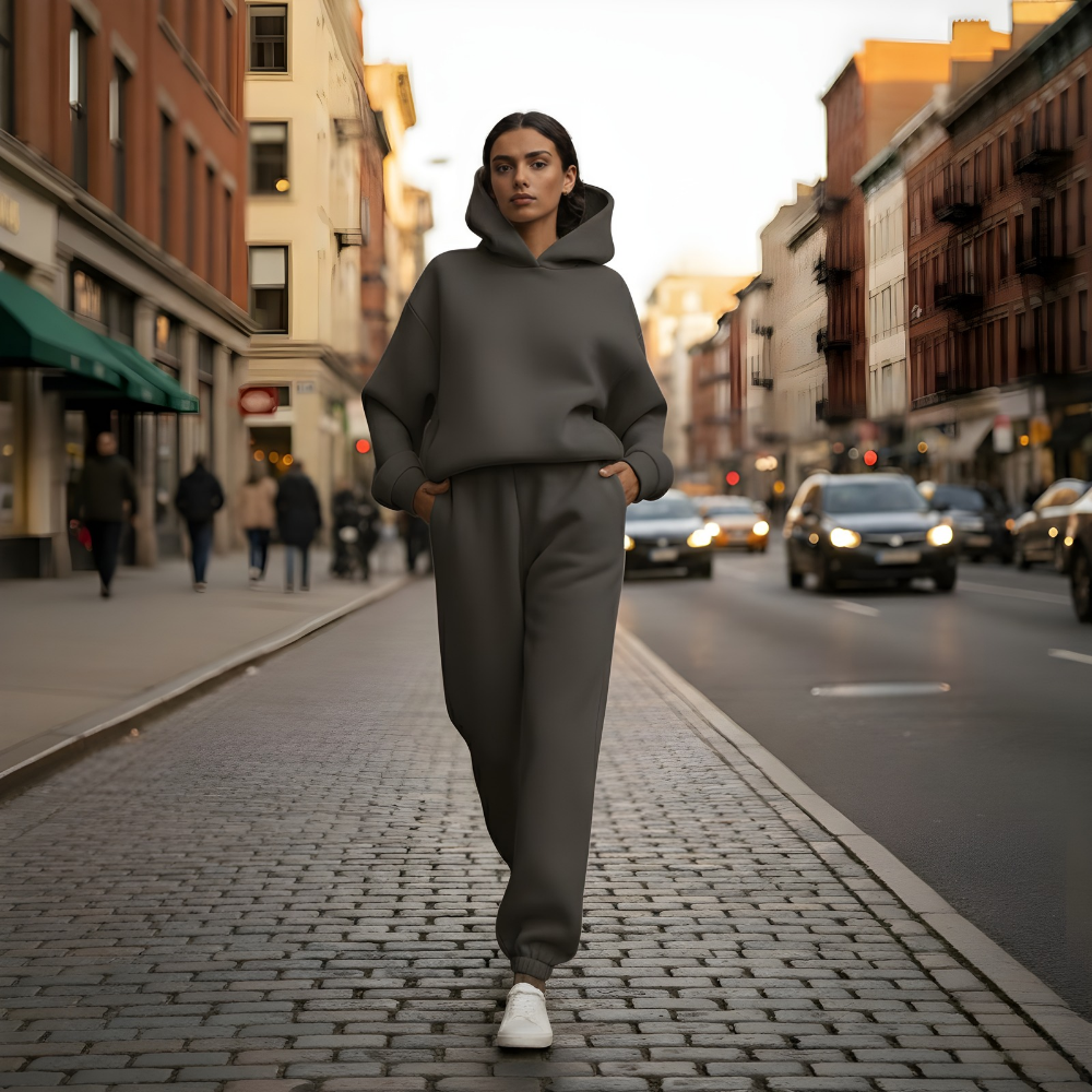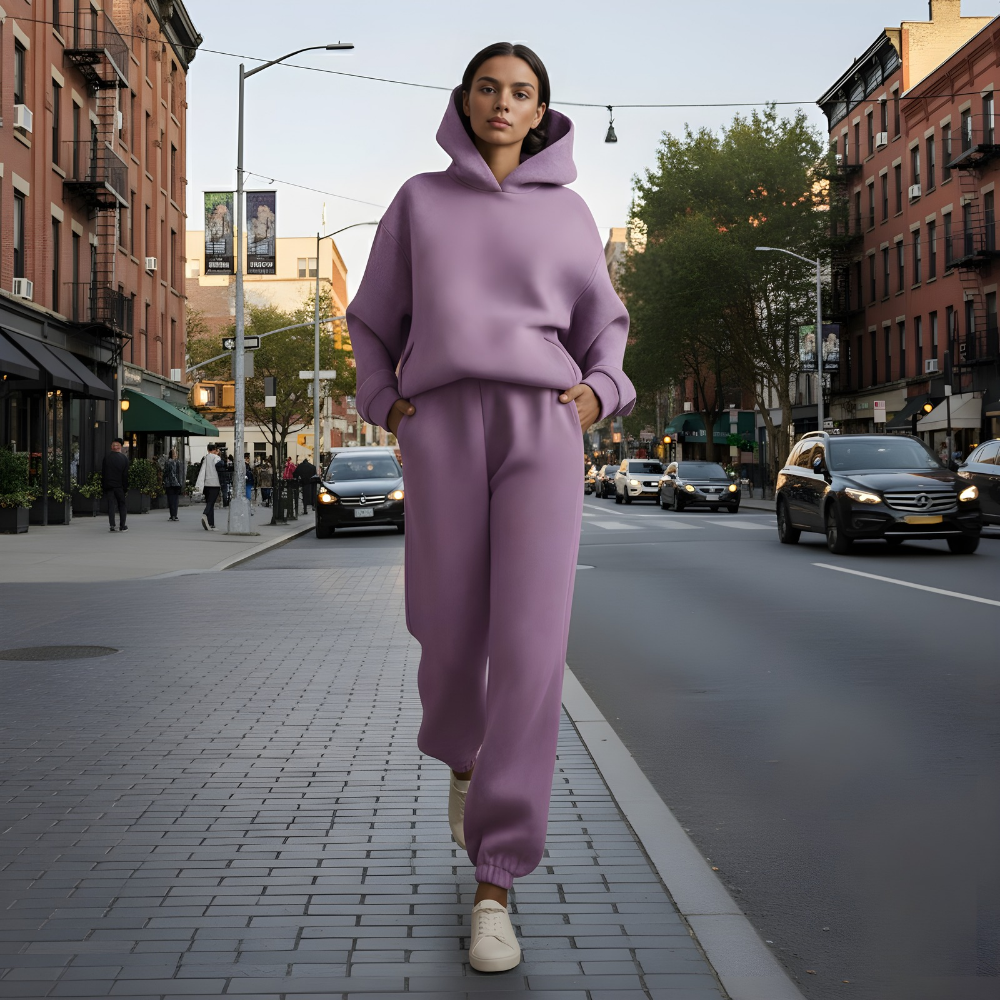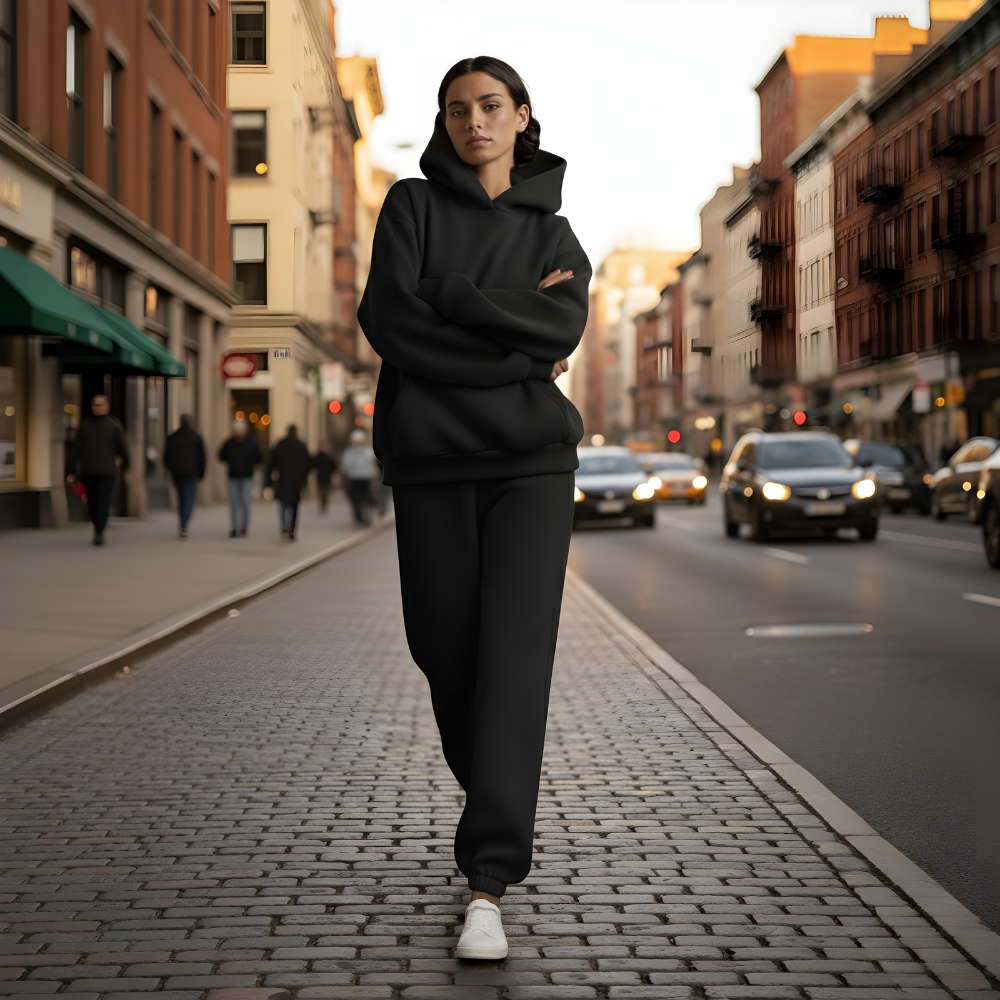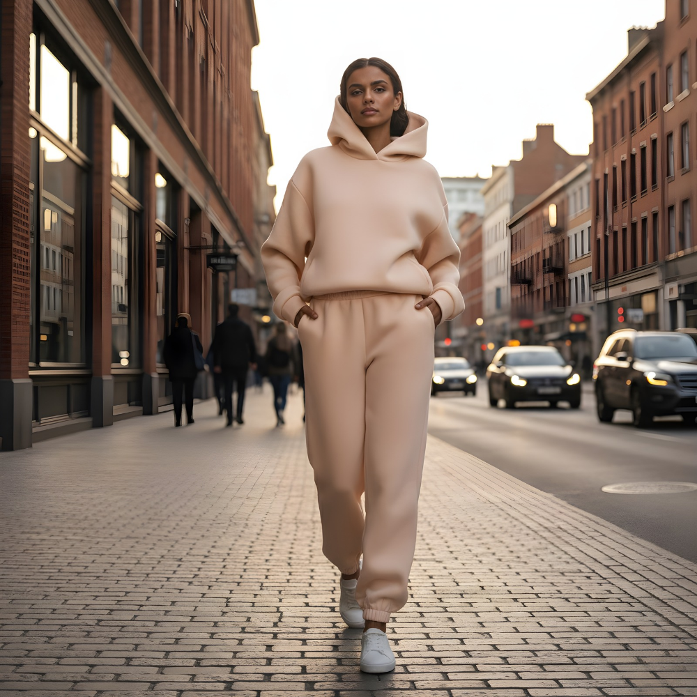 Deze Dames Trainingspak Set – Hooded Fleece Design biedt de ultieme combinatie van eigentijdse stijl en comfort, met een dikke, warme fleecevoering voor superieure isolatie tijdens de herfst en winter. Deze veelzijdige oversized set is perfect om thuis te relaxen, boodschappen te doen of als comfortabele reisoutfit. Voor het beste onderhoud, binnenstebuiten wassen op een koud, zacht programma en aan de lucht laten drogen om de zachte fleece textuur en relaxte pasvorm te behouden. Combineer deze effen set met dikke sneakers, eenvoudige gouden oorringen en een gewatteerd vest voor een complete chique, casual look.