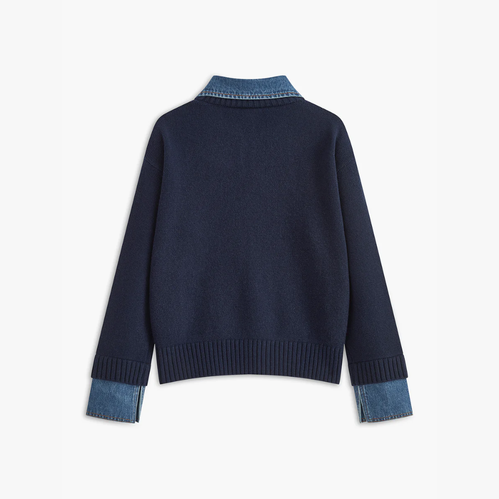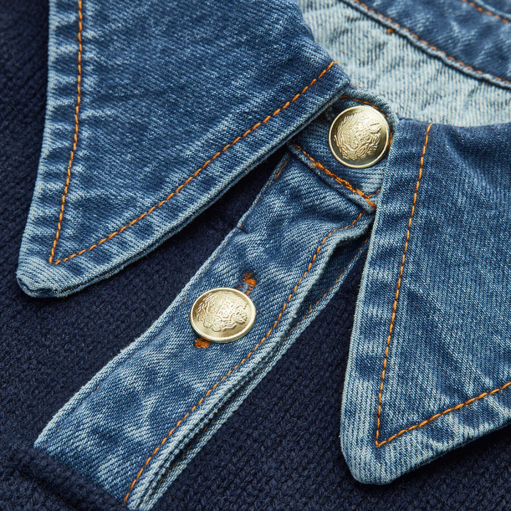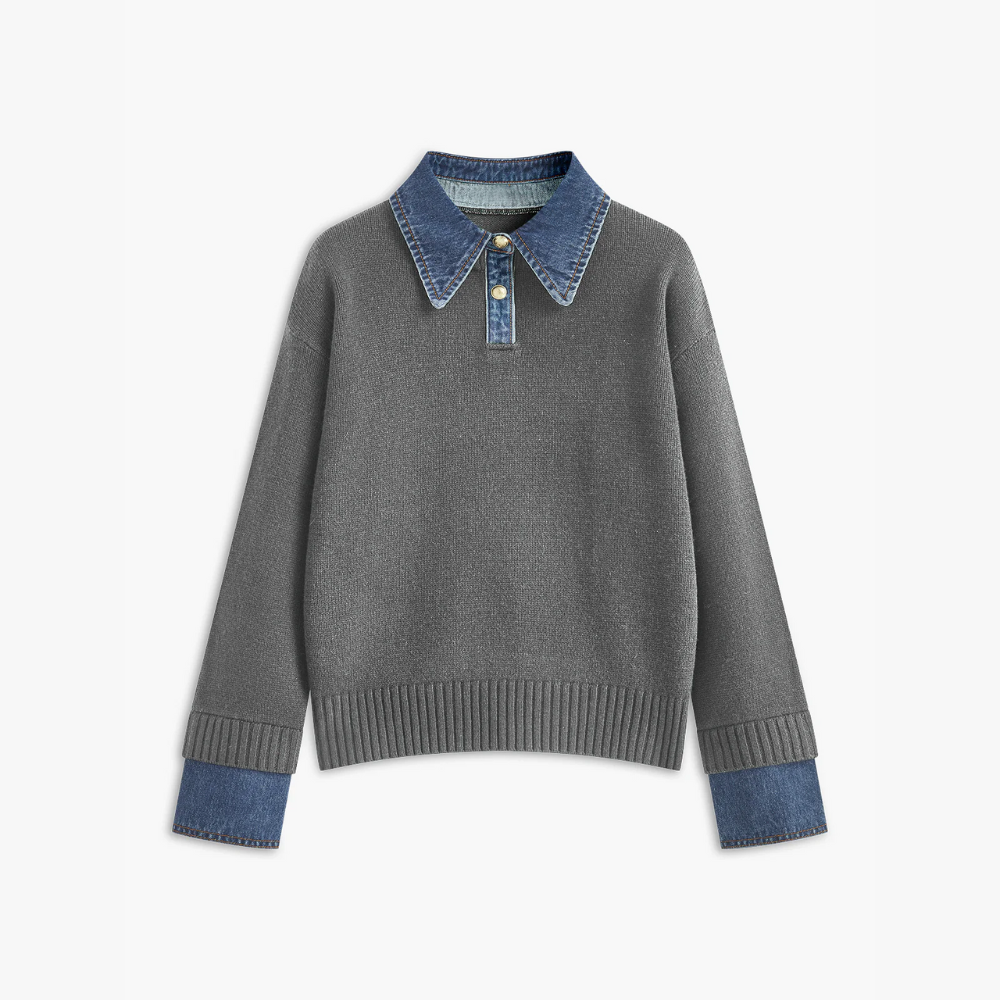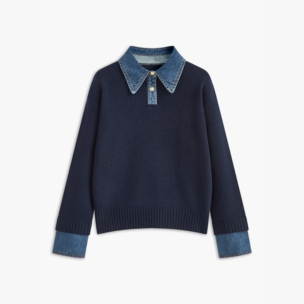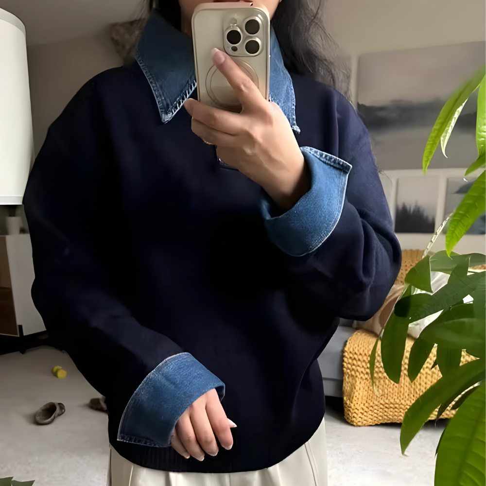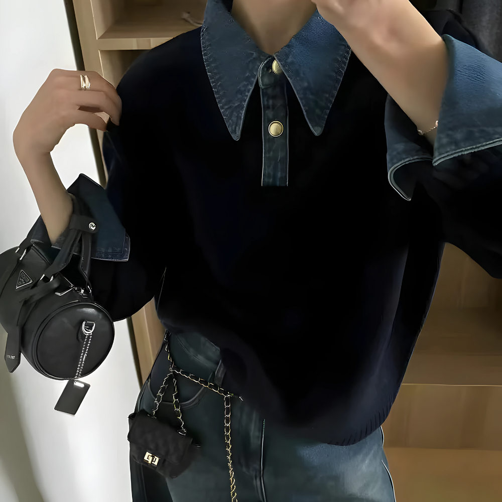 De Dames Gebreide Polo Trui combineert casual elegantie met een moderne twist. Met een zachte gebreide body en een denim kraag met goudkleurige knoopdetails is hij perfect voor chique dagkleding of ontspannen avonden. Machinewasbaar op een zachte cyclus en hangend drogen om kleur en textuur te behouden. Combineer hem met een jeans of een leren tas voor een opvallende maar toch nonchalante look.