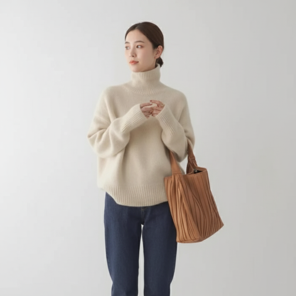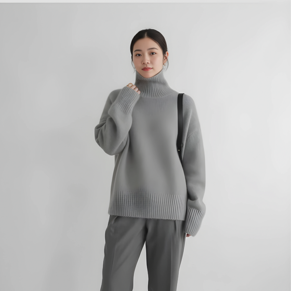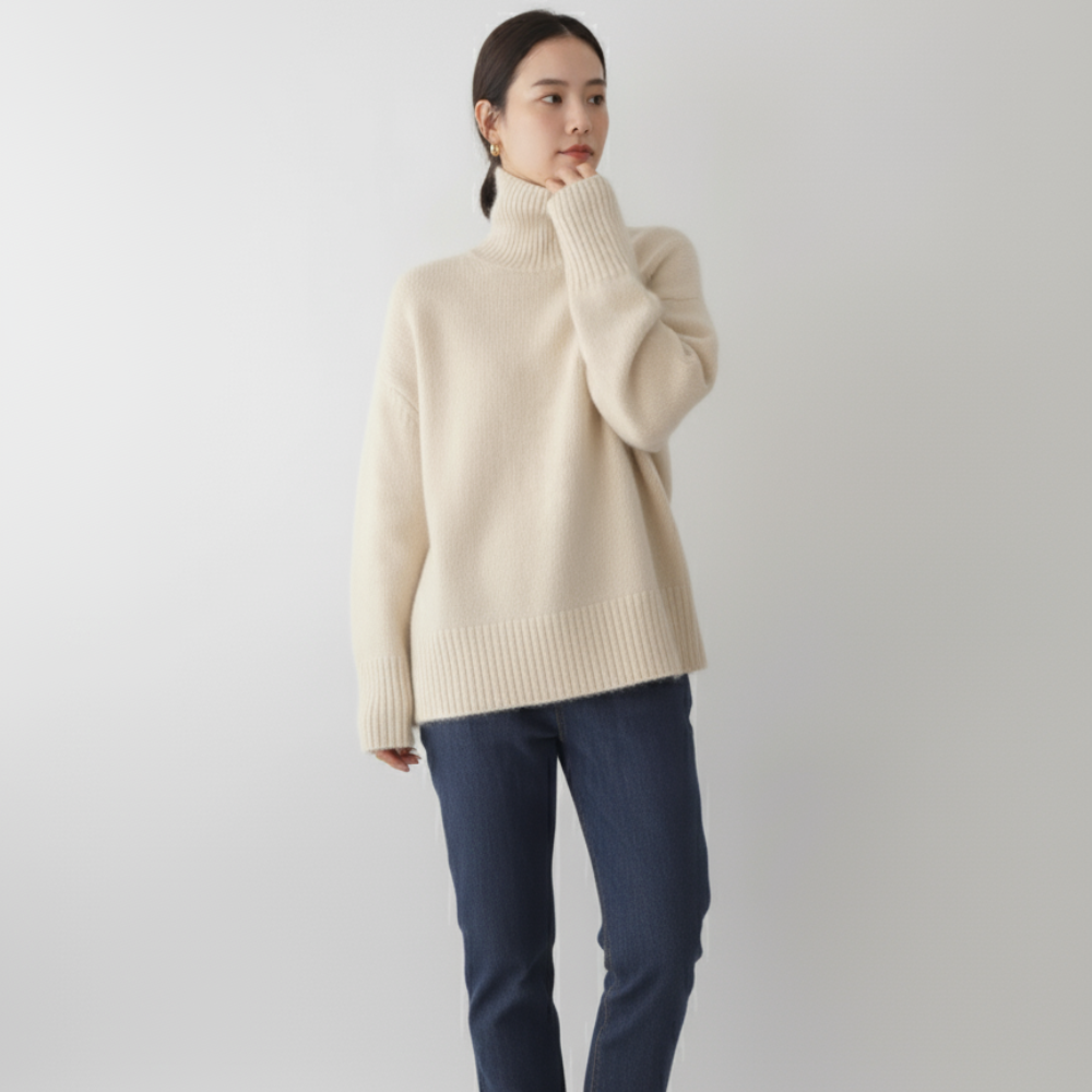 De Maison Livienne Dames Turtleneck Gebreide Trui – Casual Coltrui biedt een luxueuze mix van zachtheid en warmte, perfect voor koelere seizoenen. Hij is gemaakt van hoogwaardig nertskashmir en wol en biedt uitzonderlijk comfort en een verfijnd silhouet dat geschikt is voor zowel casual als nette kleding. Handwas of machinewas op een koud programma, niet wringen en liggend drogen om de vorm te behouden. Combineer met een pantalon, rok of laagjesjas voor een moeiteloos elegante look.