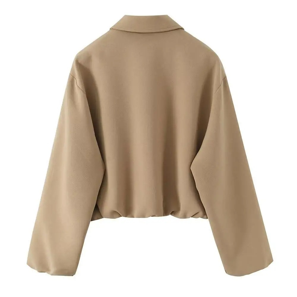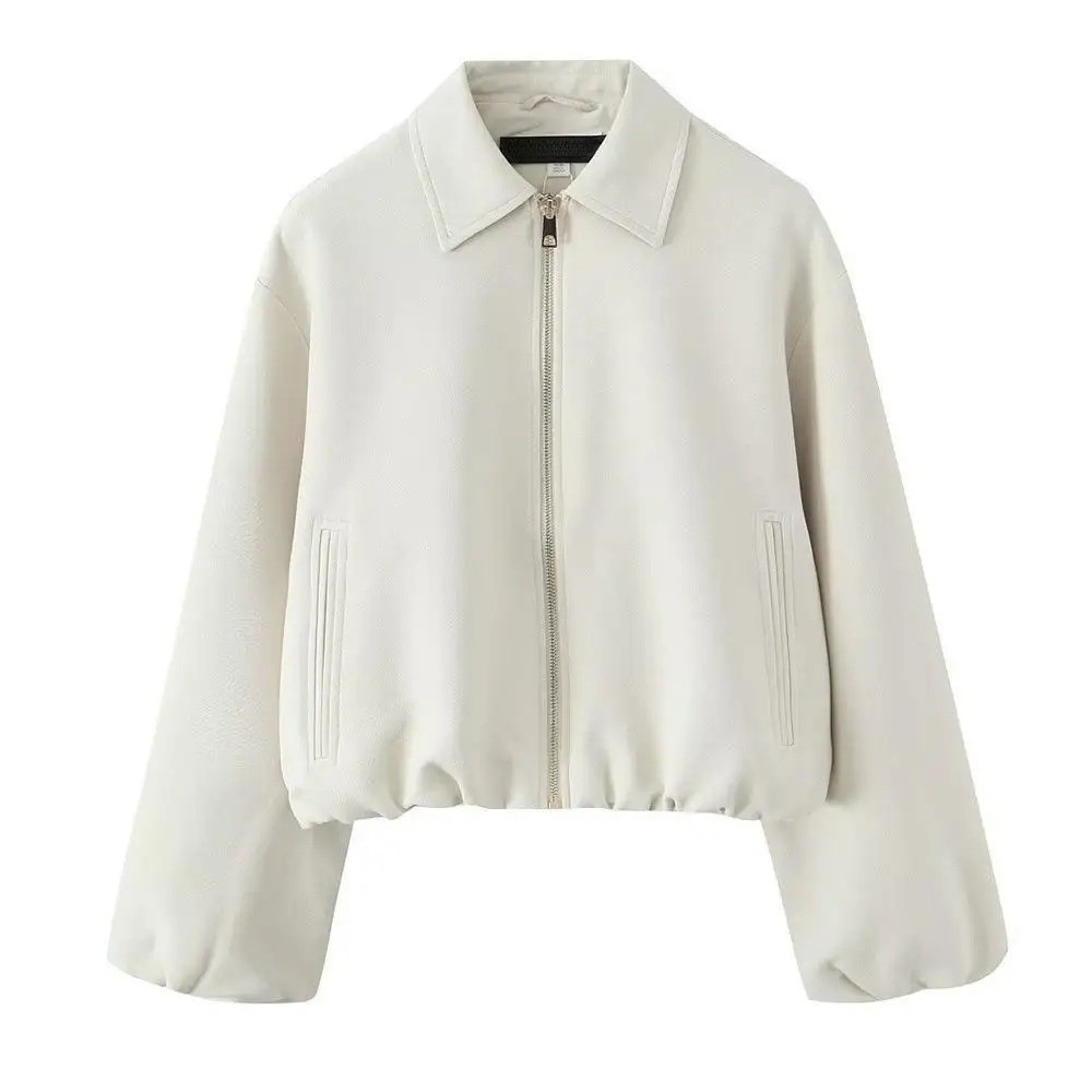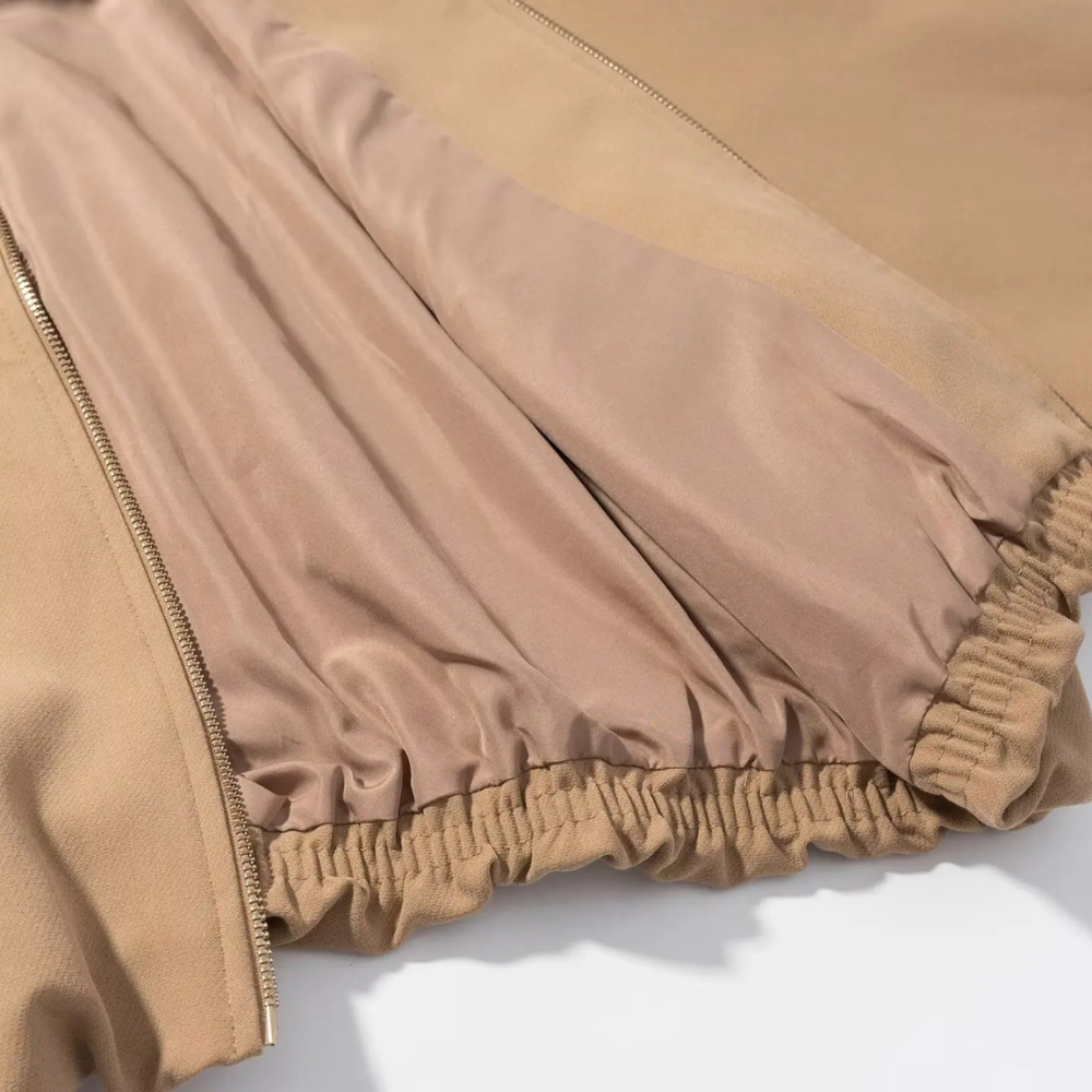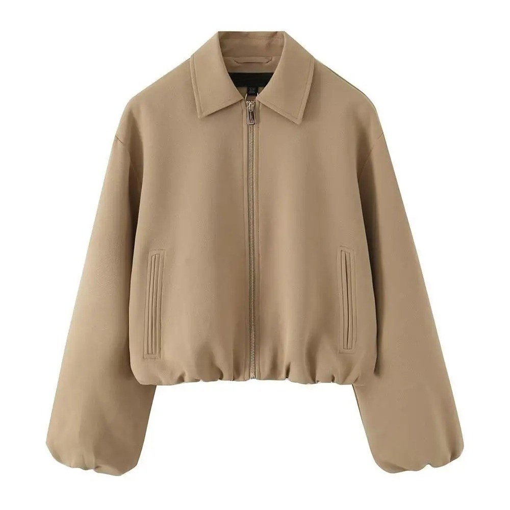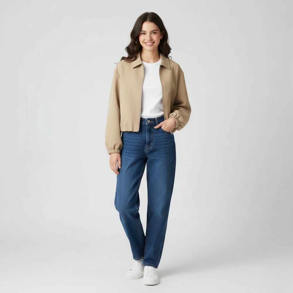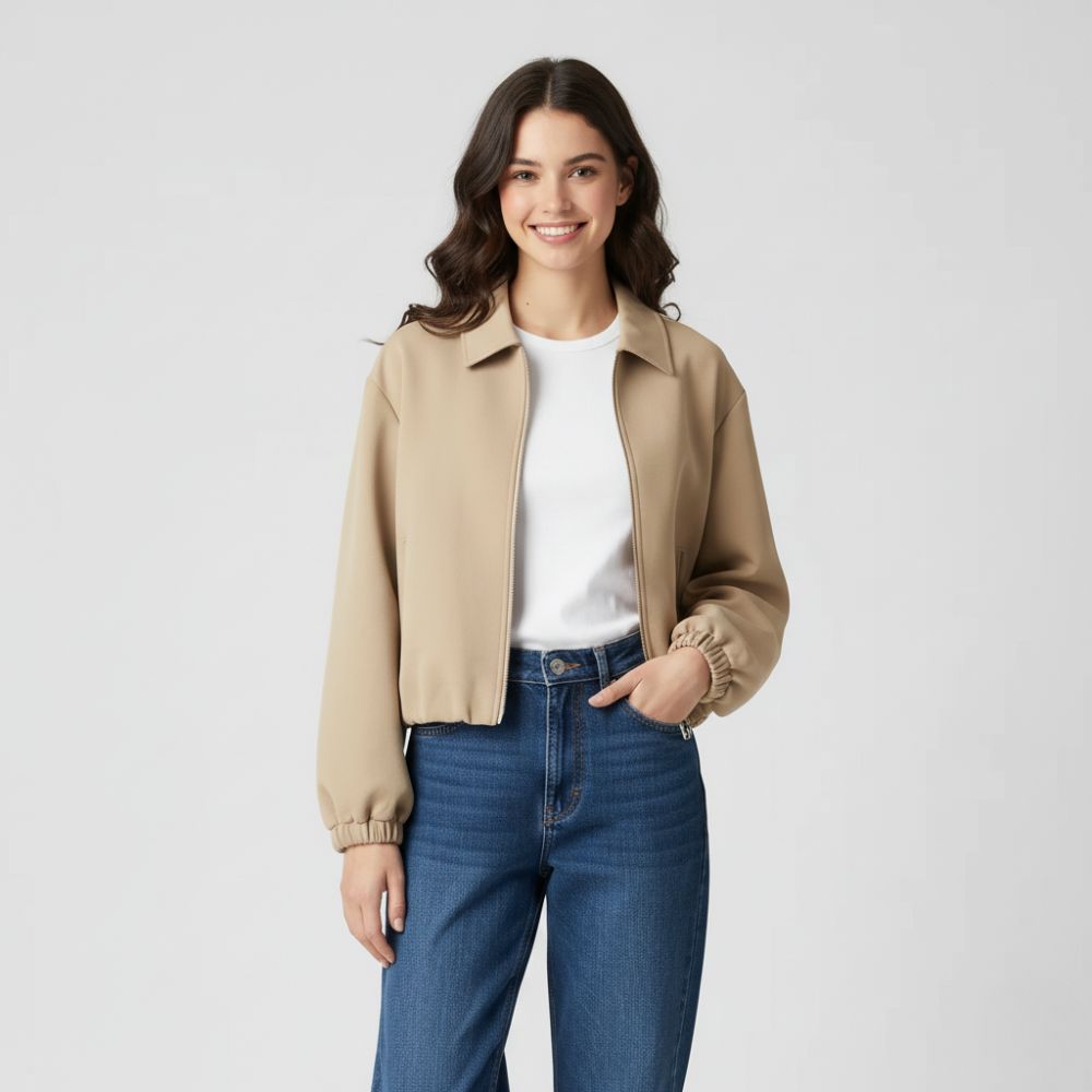 - Stijl: Kort/cropped pilotenjack (bomberjack)