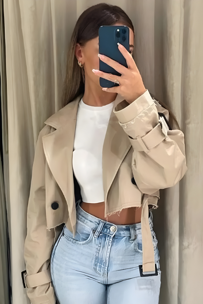 Korte trenchcoat met dubbele knoopsluiting en riemdetail