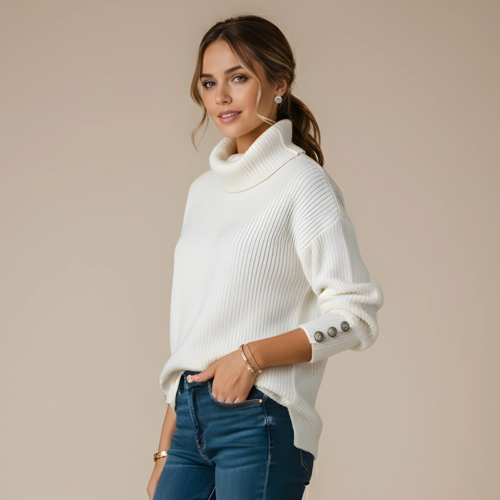 Maak kennis met de Maison Livienne trui met hoge kraag en knoopsluiting, een modieus kledingstuk dat is ontworpen voor comfort en elegantie tijdens de koudere maanden. Deze veelzijdige trui is perfect voor gezellige weekendjes weg, om te dragen tijdens herfstvakanties in de stad of om te combineren met een pantalon voor een elegante maar ontspannen kantoorlook. Om de kwaliteit en vorm van de trui te behouden, was je hem voorzichtig met de hand in koud water en leg je hem plat op een handdoek om te drogen, in plaats van een wasmachine of droger te gebruiken. Voor een complete outfit combineer je deze trui met een delicate hangerketting en draag je hem over een skinny jeans of legging, afgewerkt met stijlvolle enkellaarsjes.