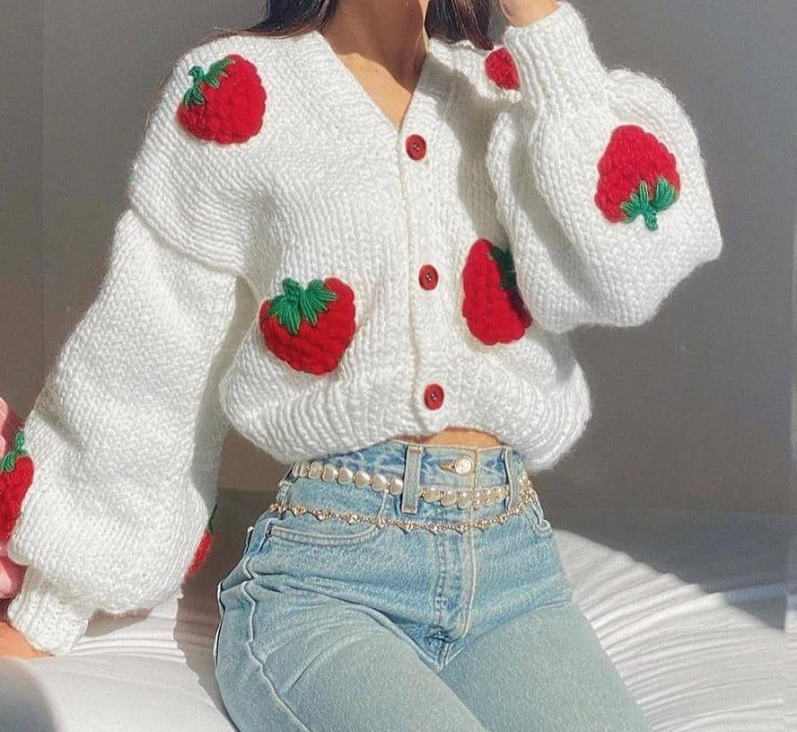 Aardbei Losvallende Gebreide V-Hals Cardigan