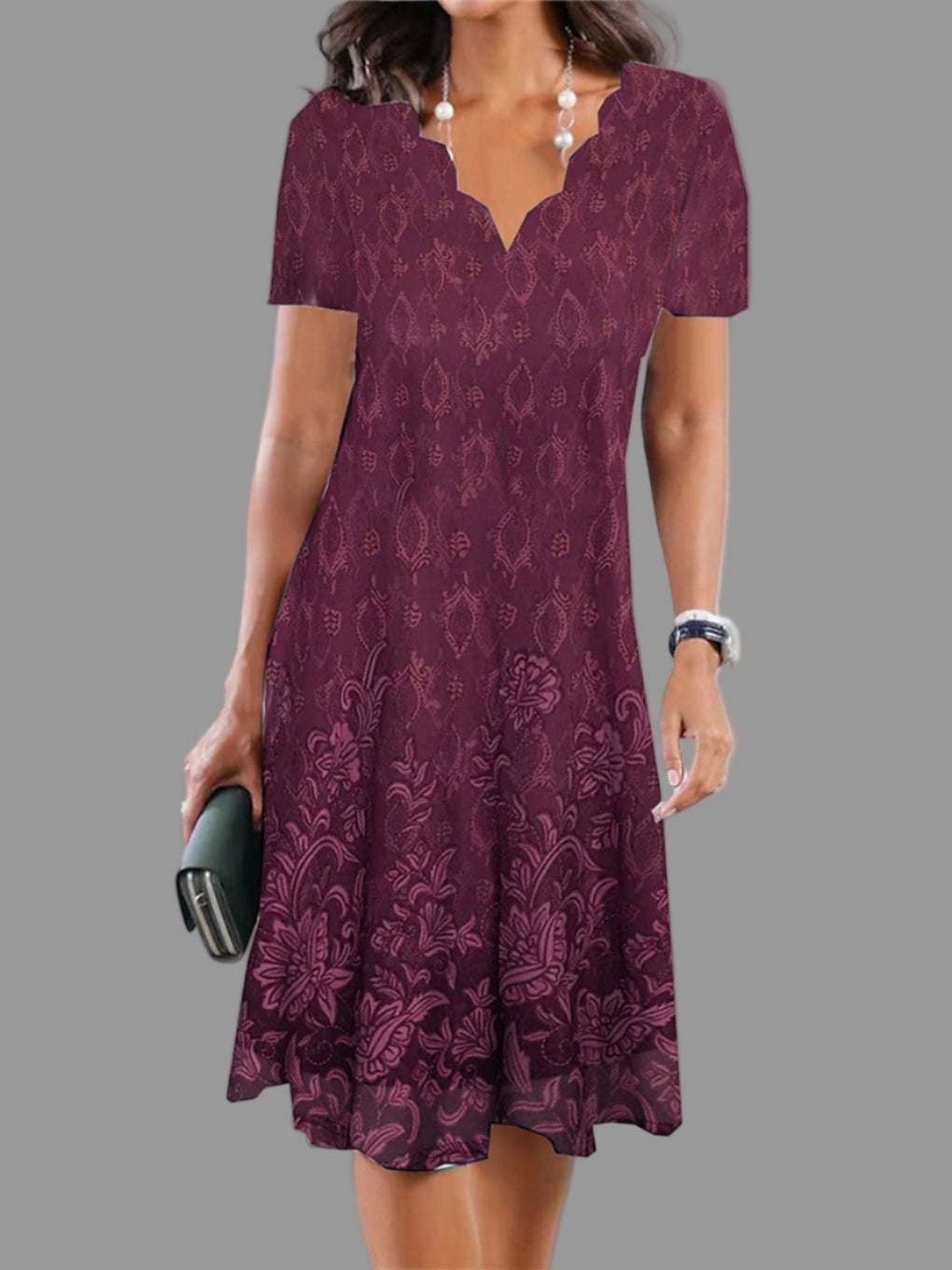 Dames midi-jurk met bloemenprint – Fuchsia V-hals korte mouw