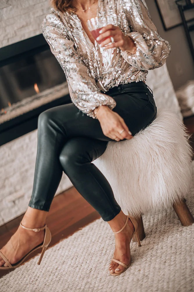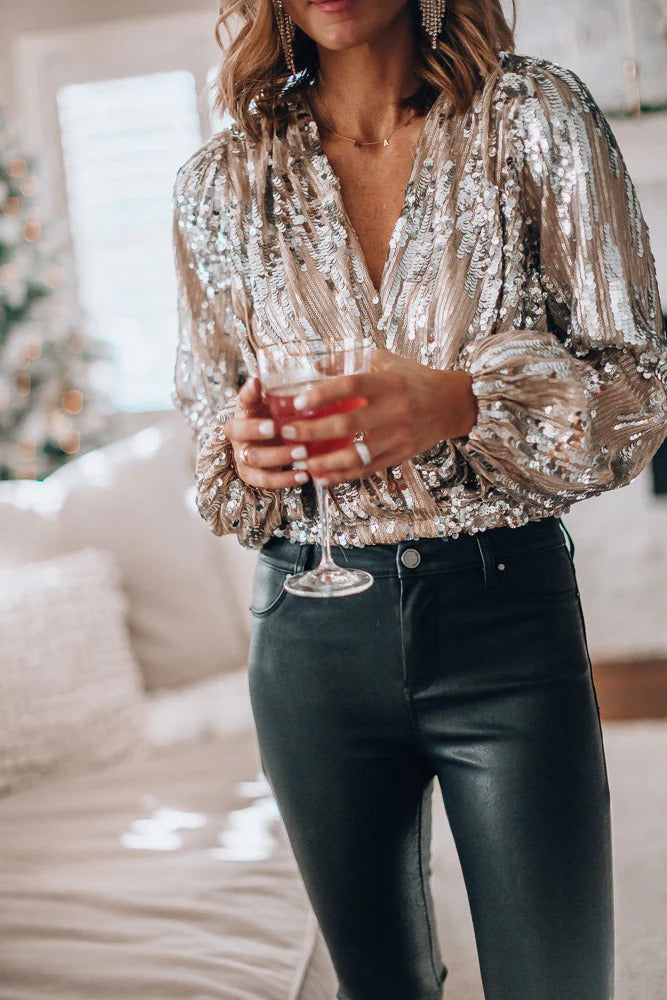 Damesblouse met V-hals en lange mouwen met pailletten